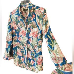 Tommy Bahama Sz S Teal Pink Hibiscus Linen Summer Button Down Collar Shirt
