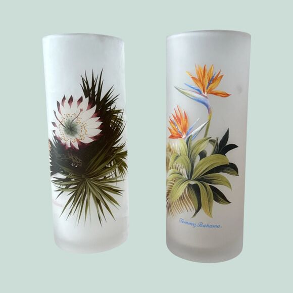 Tommy Bahama Tall Frosted Glasses Set Tropical Bird of Paradise Palm Highball
