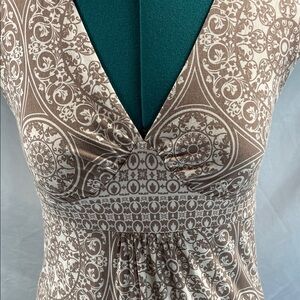 Chic taupe midi dress with geometric design. Ideal for casual elegance.