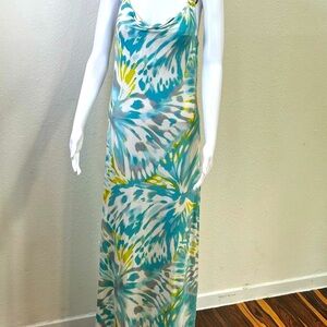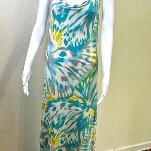 Elegant dress with vibrant teal and yellow floral design. Ideal for sunny days.