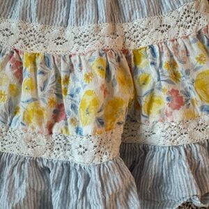 Add a touch of island charm to your little one’s wardrobe with this adorable Tommy Bahama baby dress! Featuring a tiered design with a mix of blue stripes, yellow floral prints, and delicate lace trim, this dress is perfect for sunny days, special occasions, or a cute everyday outfit. Elastic back for easy sizing.
