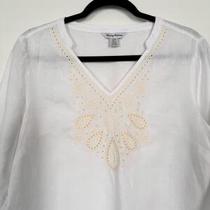 Tommy Bahama Tunic Top. Women’s Small. White. 100% Linen. Beaded. Relax Fit. V-Neck, 3/4 sleeves. Bohemian, Beach, Vacation