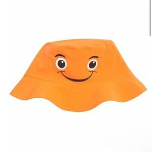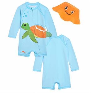 chest. Matching orange bucket hat with smiley face. Green raglan long sleeved one piece swimsuit with blue, green and white stripes Swimsuit features a large shark graphic on chest. Matching blue bucket hat with shark face and fin. Swimsuit features zipper down front with zipper guard at neck