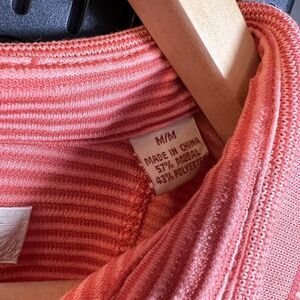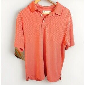 This is a Tommy Bahama polo shirt in size M, featuring a striped pattern in shades of peach and orange. Made from a soft blend of polyester and modal, it has a collared neckline with a button-down closure and short sleeves. The fabric is a blended fabric type, providing a comfortable and stylish option for all seasons.