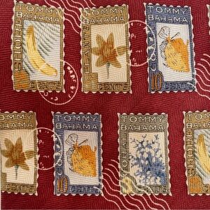 Elegant, vintage Tommy Bahama tie with a distinctive stamp pattern. Ideal for a sophisticated look.