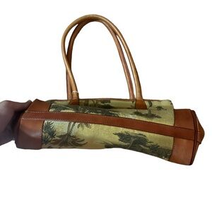 Tommy Bahama Vintage tropical Canvas bag in mustard yellow with palm trees. Gently used condition with light external wear as pictured. Leather trim.