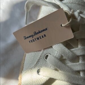 Stylish white canvas espadrilles by Tommy Bahama. Features classic lace-up design and woven sole. Ideal for casual wear.