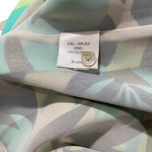 Tommy Bahama Women’s Aqua Blue Brown Palm Leaves and Cream 100% Silk Fully-Lined Floral Slip Sheath Pullover with Single Button Closure at the Neck MIDI Length Dress Size 8. This dress is preowned and in very good condition.