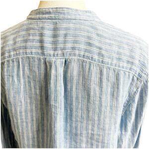 This Tommy Bahama Women's Linen Button Front Shirt in size Large features a blue and green striped pattern, perfect for travel, parties, or casual occasions. The shirt has long sleeves, a Mandarin collar, and button closure. Made of lightweight and breathable linen fabric, this tunic-style top is machine washable for easy care. The relaxed fit and tropical theme make it ideal for summer, fall, and spring seasons, representing a classic yet beachy look. Perfect for a day at the beach or a vacation getaway.