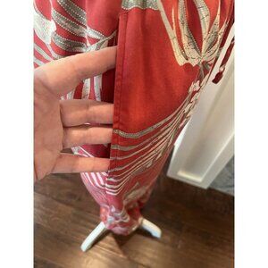 Fun and fabulous 100% silk drawstring full leg pants. Perfect for vacation, a night out or just running errands. Red and khaki dominate colors in this floral pattern. Womens size medium, Adjustable waist (drawstring), 29" inseam. Hidden side pockets. Excellent condition and so fun!