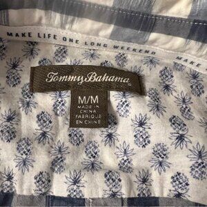 Elevate your everyday style with this Tommy Bahama long sleeve button-down shirt in a fresh blue and white check pattern. Made from 100% breathable cotton, this medium-weight shirt is perfect for casual days, vacations, or layered under a jacket for a polished look. The interior collar features a fun pineapple print and the brand's signature quote: “Make Life One Long Weekend.” Designed with comfort and style in mind, this shirt offers a relaxed yet refined vibe ideal for the modern man. Size medium.