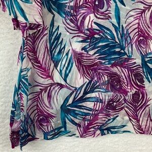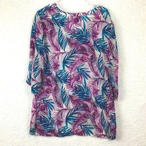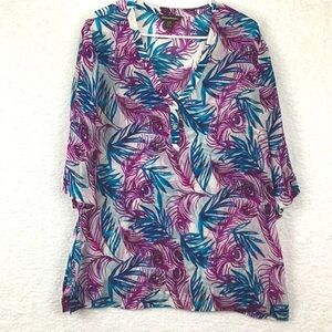 Tommy Bahama Women’s Size Lg. Sheer and Gauzy Layering Blouse. Beautiful Purple and Teal Peacock and Foliage Design. 3/4 Sleeves.