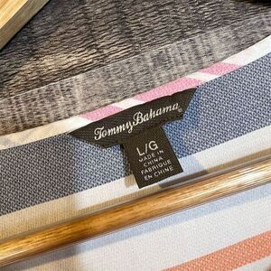 Keywords: Tommy Bahama blouse, women's striped blouse, multicolor blouse, V-neck blouse, short sleeve blouse, cotton blouse, lightweight blouse, breathable blouse, tie front blouse, relaxed fit blouse, casual blouse, summer blouse, machine washable blouse, pre-owned women's blouse, women's fashion top, Coastal Grandma, Ocean, Beach, Nautical, Soft, Comfy, Breezy