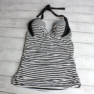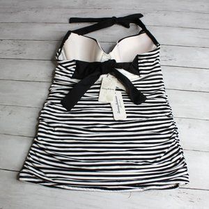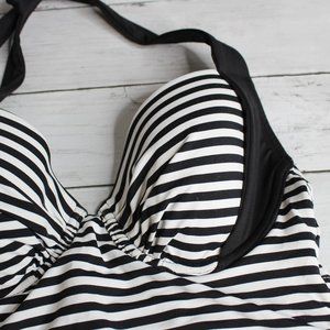This black and white stripe halter tankini swim top has padded cups that are molded with underwire. The back of the top has a tie behind the neck and a bra tie. It is brand new with tags. I have this same style top in different cup sizes if you need C or D.