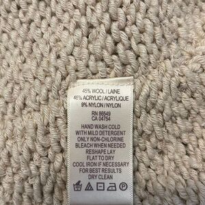 This sweater is made by Tommy Bahama. It’s a creamy-tan color, open front style, made of wool, acrylic, nylon. Size small and in great pre owned condition. Smoke and pet free home.