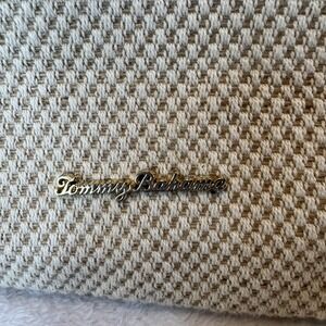 Brand markings: Interior fabric label "Tommy Bahama," logo script plaque, logo-printed lining, and branded wrist strap