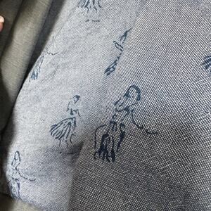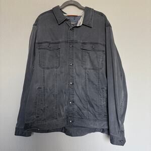 Tommy Bahama men’s jacket in size XXL. Washed gray denim/canvas look with button front, flap chest pockets, and side pockets. Unique detail: interior aloha-style print lining featuring hula dancers. Heavyweight, durable fabric—perfect for layering in fall.