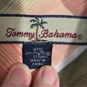 Tommy Bahama size XXL plaid short sleeved shirt in shades of peach, orange, and green. 100% tencel lyocell, cool and airy for summer.