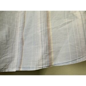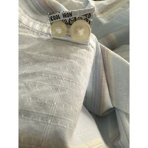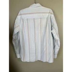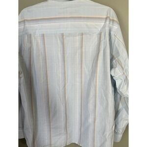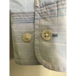Tommy Bahama blue Stripe Button Collar Cotton Dress Shirt size large FLAW. The sleeve buttons need to be replaced, see pictures. The tag has 2 replacements. On the inside has a name, can’t be seen from the outside. Other than that great condition. Smoke free home.