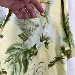Immerse yourself in the spirit of the island lifestyle with this quintessential Tommy Bahama floral Hawaiian men's shirt, size Large (L). Boasting a refreshing tranquil pale yellow backdrop, the shirt features an exquisite spread of tropical flora including lush greenery and exotic blooms. Every stitch embodies the classic comfort and casual elegance expected from the Tommy Bahama brand, with a relaxed fit that’s perfect for summery days or vacation lounging. The high-quality, breathable fabric ensures maximum comfort in warm weather, while the short sleeves and button-down front offer versatility for a variety of occasions, from beach gatherings to casual dinners. This shirt is a timeless piece that captures the essence of relaxed sophistication, making it an essential addition to any wardrobe looking to channel the aura of paradise.