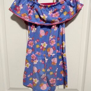 Tommy Bahama girls jumper. Blue and pink with shells and flowers. Ruffle collar going around it. Size extra small.