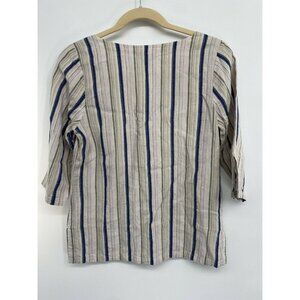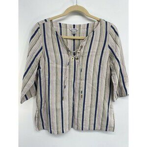 Tommy Bahama large linen blend top stripe Silver Metallic Boho 3/4 SLEEVE LACE NECK LINE