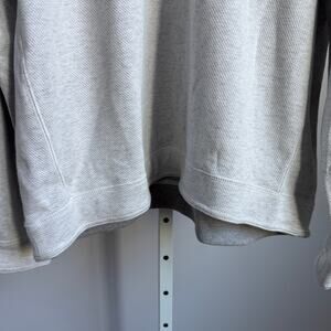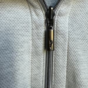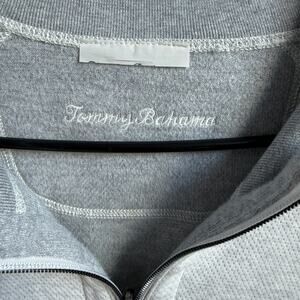 This is a pre-owned Tommy Bahama quarter-zip pullover. It is light gray and made of 79% cotton and 21% Tencel Lyocell. The pullover features a gray ribbed collar, cuffs, and hem. The zipper is black. There are no visible stains, tears, or holes. The garment shows minimal signs of wear consistent with pre-owned condition.