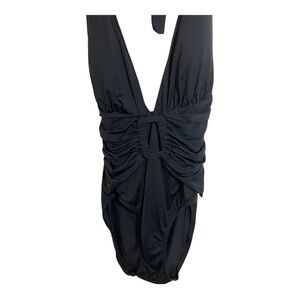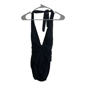Tommy Bahama V-Neck plunge one piece swimsuit. Black size 8 halter neckline buckle front design.