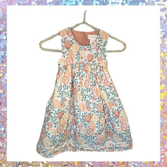 Citrus Queen! This girls dress is absolutely gorgeous and photos do not do it justice! It features a pastel citrus pattern in a princess cut, cutout back, and is fully lined so that it hangs beautifully.