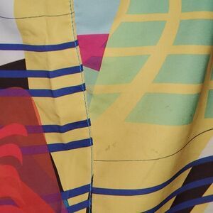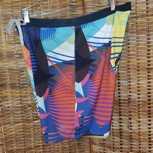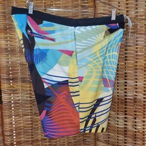 This is a pair if Tommy Bahama Relax board shorts. They have a zippered fly, tie at waist, hand slit pockets, and a zippered pocket on back. Small stains on front right .. see pic.