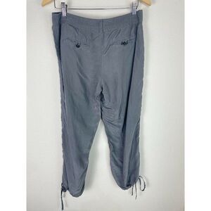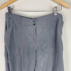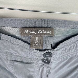Tommy Bahama gray silk drawstring button up joggers size 6. Zipper button closure. Drawstring at pant hem, two front pockets, two button close back pockets. Waist approximately 16”, rise approximately 9”, inseam approximately 23.5”.
