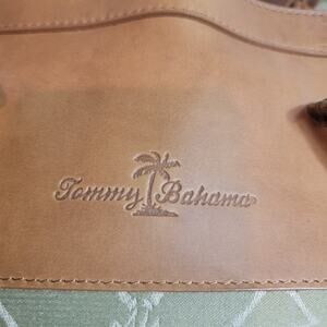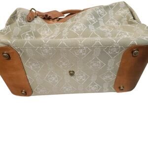 Tommy Bahamas Travel Bag in a light olive green and tan color scheme. This carry-all duffle bag is perfect for overnight trips. Please note that it is missing the shoulder strap which is reflected in the price.