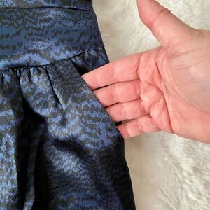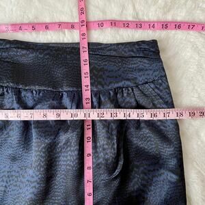 Super cute mini skirt by Tommy in shiny sateen with a blue and black pattern that looks similar to a snakeskin print. It has a wide waistband and side pockets. Excellent preowned condition. Size 6. Measurements included in photos.