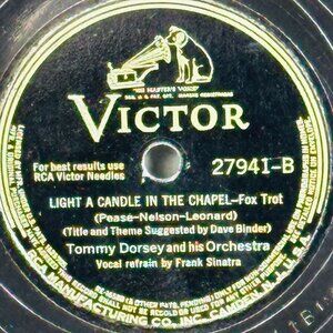 Immerse yourself in the golden age of swing with this vintage Victor 78 RPM record. Featured are two enchanting Fox Trot tracks, "He's My Guy" with Jo Stafford's heartfelt vocal refrain and "Light a Candle in the Chapel," softly serenaded by none other than Frank Sinatra.