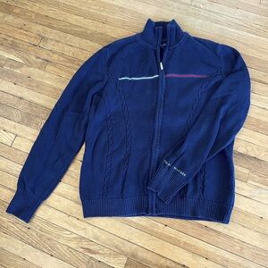 Tommy Hilfiger 100% Cotton Navy Full Zip Cable Knit Mock Neck Sweater | Large