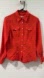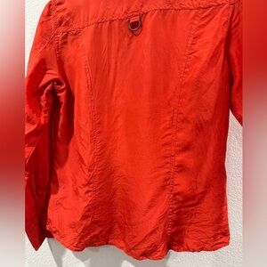 100% silk, burnt orange color, collared, buttoned front and cuffs, buttoned chest pockets, extra button includes, crinkled, long sleeves, curved hem, vibrant, colorful