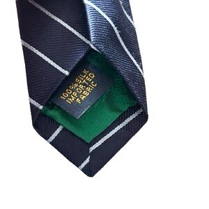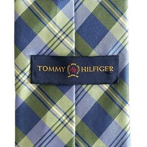 This Tommy Hilfiger 100% Silk Patternblock Tie features a Blue/Green Plaid pattern at the main blade and a Navy/White Stripe at the tail. It measures approximately 58.5” in length, and approximately 3.6” at the widest part of the blade, and is in good condition!