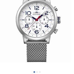 Stylish and functional, this Tommy Hilfiger Jake model (1791233) features a crisp white dial with multi-function subdials, including day, date, and 24-hour time. Comes with a sleek metal mesh strap and signature Tommy Hilfiger detailing.