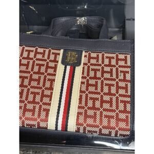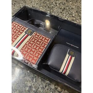 This stylish Tommy Hilfiger 2-Piece Gift Set includes a patterned mini tote bag and matching zip coin purse. Both items feature the classic Hilfiger stripe and gold-tone TH logo. Comes new in original box (box has wear—see photos).
