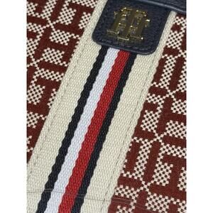 • Mini Tote Bag – Red/cream TH monogram pattern, navy faux leather trim, woven stripe detail