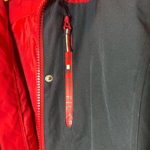 This is missing the inner zip in fleece but the main piece, this exterior jacket is still amazing. spell out logo, logo pulls, lined, locker loop, 3 front zip pockets, logo patch on right arm, 85% polyester 15% cotton, lining 100% polyester, machine wash, gathered rear waist, balaclava style hood and mock neck, removable hood, cinch drawstring hood, 1 inside pocket, Tommy Hilfiger 3-in-1 Weather System Jacket Hood JUST THE OUTER JACKET Women XL