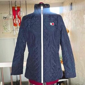 Tommy Hilfiger 3-n-1 All Weather Jacket. Quilted navy blue jacket with full front zipper, side pockets and inner pocket.