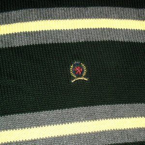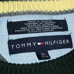 New with tags Mens sz. XL Tommy Hilfiger Striped Sweater. It is Hunter Green, Yellow, and Grey. The front has the embroidered Tommy Hilfiger logo on it. Made of cotton material. It measures from top of shirt to bottom of shirt is 29 inches and from armpit to armpit is 26 inches.