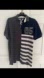 Rare find! polo shirt with a color block design. The left side of the shirt is solid gray, while the right side is navy blue with a white and gray striped pattern at the bottom. There is a "85" graphic on the upper right side of the shirt.