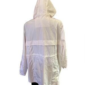 Stay stylish and protected with this Tommy Hilfiger hooded anorak windbreaker jacket. This lightweight jacket is perfect for layering and features a comfortable fit. The classic white color and iconic Tommy Hilfiger design make it a versatile addition to your wardrobe. It is in excellent condition.