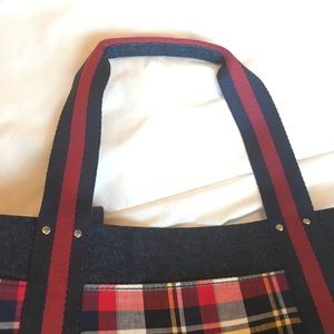 New! Never used! Red and blue plaid Tommy Hilfiger purse. Two outside snap pockets on either end of purse and outside pocket in front and back. New, never used. Great condition 14 in long x 9 in tall x 6.5 in wide.