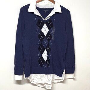 Tommy Hilfiger Argyle Layered Sweater Navy White Preppy V Neck Classic Pullover
