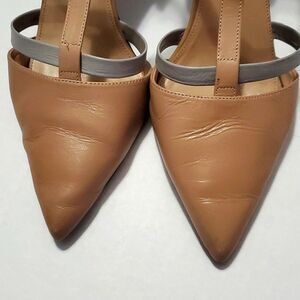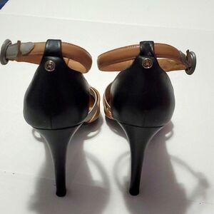 Nude, black and gray color block classic heels. Pointed toe and covered heel. Strap around the ankle with a rounded buckle. They appear to be leather. 3.5" heels.