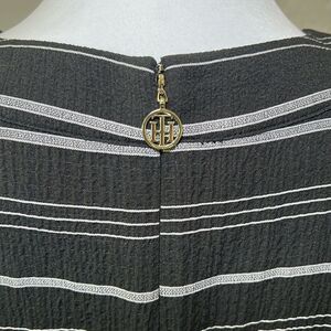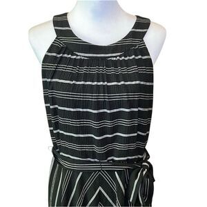 Tommy Hilfiger striped midi dress, halter neck summer dress, belted gauze dress, black gray stripe dress, sleeveless midi dress, lightweight vacation dress, resort wear dress, beach to dinner outfit, Tommy Hilfiger dress size 12, crinkle gauze halter dress, elastic waist midi, keyhole back dress, flattering waist tie dress, preppy striped dress, summer party dress, casual elegant midi, black and white stripe dress, versatile halter dress, office to dinner dress, comfy stylish dress