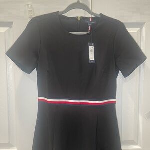 This casual black midi dress by Tommy Hilfiger features a classic A-line silhouette with a crew neck and short sleeves. A striking red and white stripe at the waist adds a touch of contrast, making it perfect for work or casual outings.